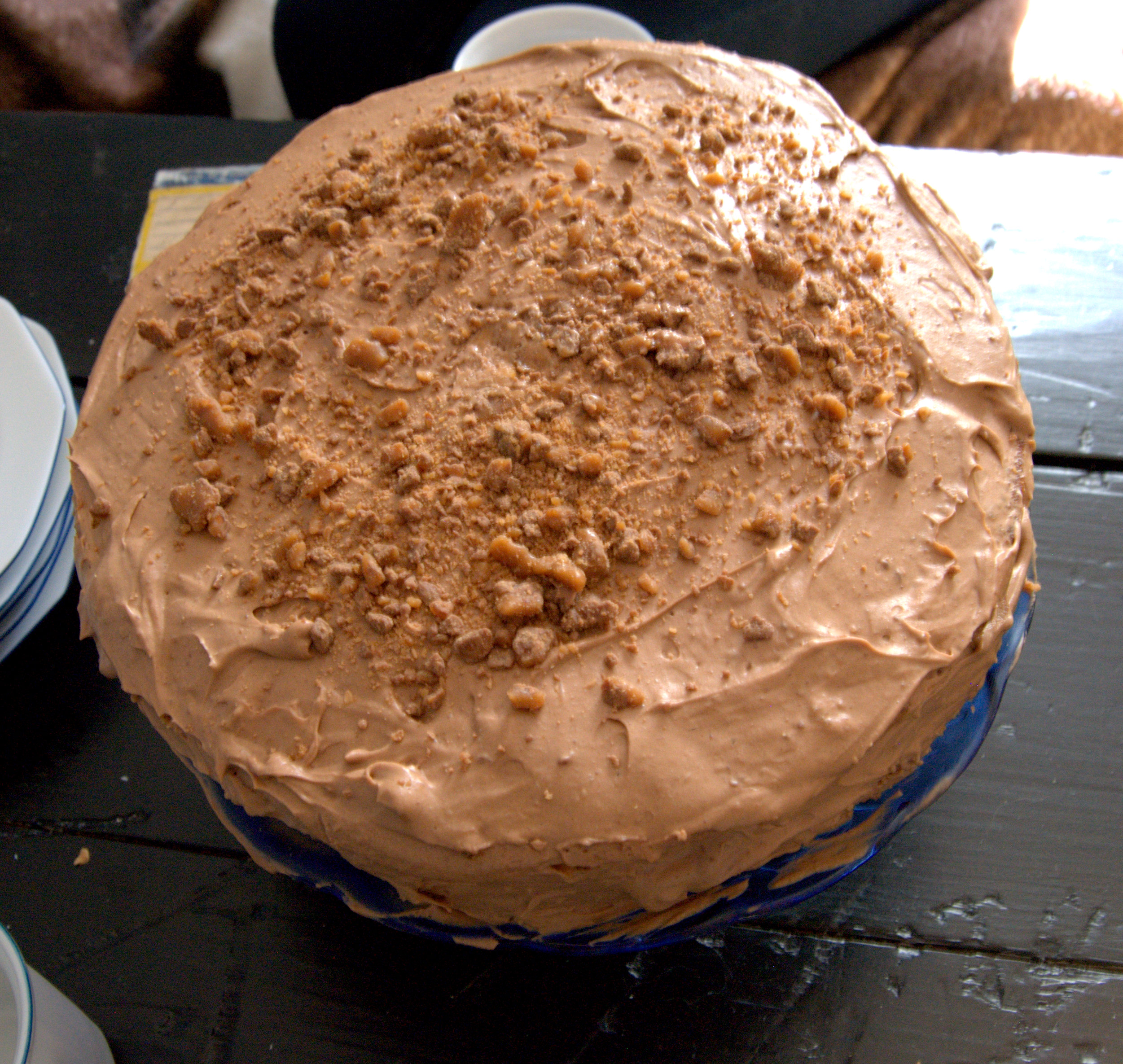 Tårtan fylldes med en jordgubbsmousse, glasscreme och täcktes med Fazer Mjölkchoklad med smak av Marianne och uppe på strödde jag över krossad daim.