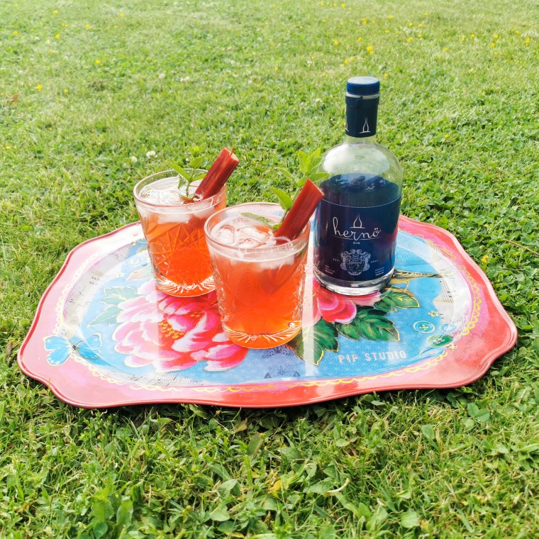 - Drinken: Pressa ut saften från en lime i en shaker och tillsätt myntablad från två kvistar. Muddla samman juice och myntablad i shakern. Tillsätt gin, 1,5 dl rabarbersirap och is. Skaka kraftigt.