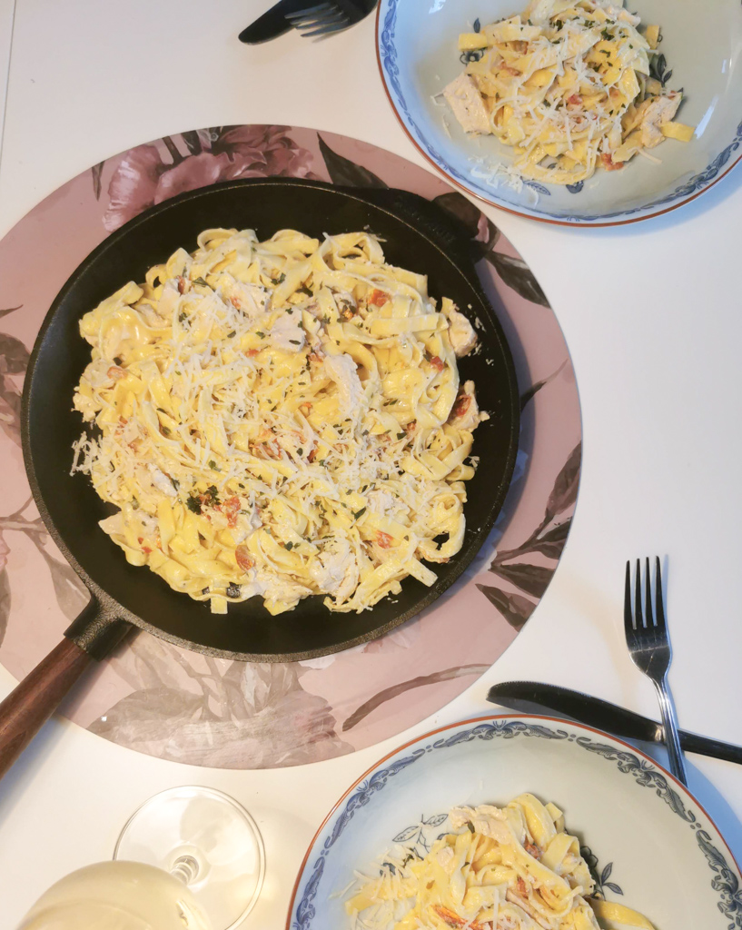 Vad är comfort food för dig? För mig är det nog en riktigt god, välgjord pasta. Jag levde low carb under många år men något jag verkligen saknade var en god pasta, med mycket ost – of course! Den här pastan som ni får ta del av idag är ett välbeprövat recept som passar perfekt in i vår vardag – den går snabbt att tillaga, men är ändå lite åt det lyxigare hållet. Den innehåller soltorkade tomater och parmesan, två stora favoriter.